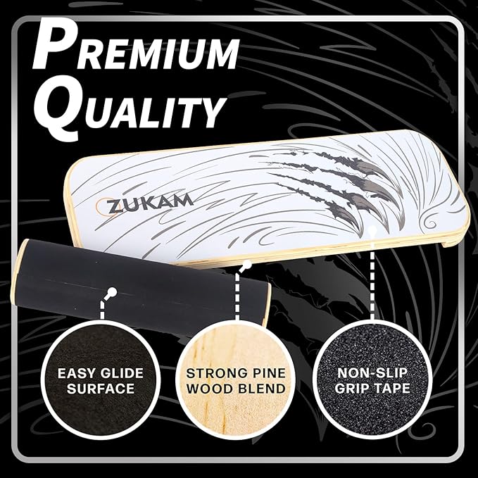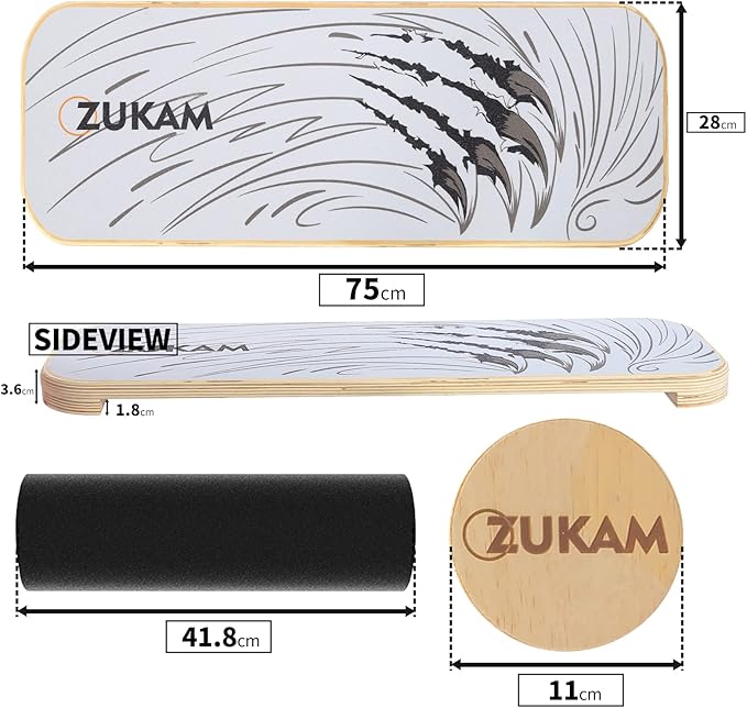 • [What’s included] - The Zukam Balance Board comes with board, roller and workout guide. The board measures 75x28cm , and the roller has a diameter of 11cm and a length of 41.8cm.