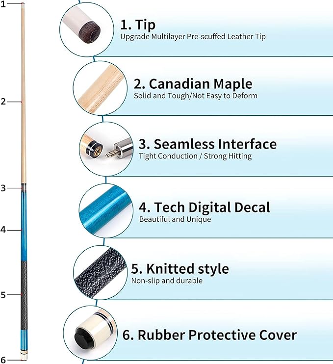 • Canadian Maple Wood:Firm and durable, we have chosen the best quality for the pool stick and the pool cue tips durability. Each pool cue case contains 4 unique pool cues sticks
