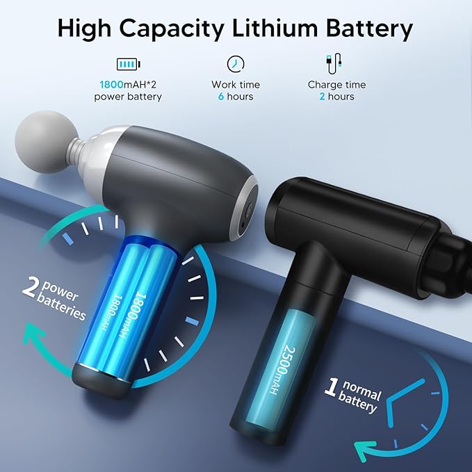 • HIGH-CAPACITY LITHIUM BATTERY: Powered by 2 * 1800mAh batteries, the high-quality rechargeable battery gives this electric massage gun longer battery life; The Travel Massage Gun can continuously run for 8 hours and takes 3 hours to fully charge through the USB cable. Its exact working time depends on vibration frequency and massage pressure during massage.