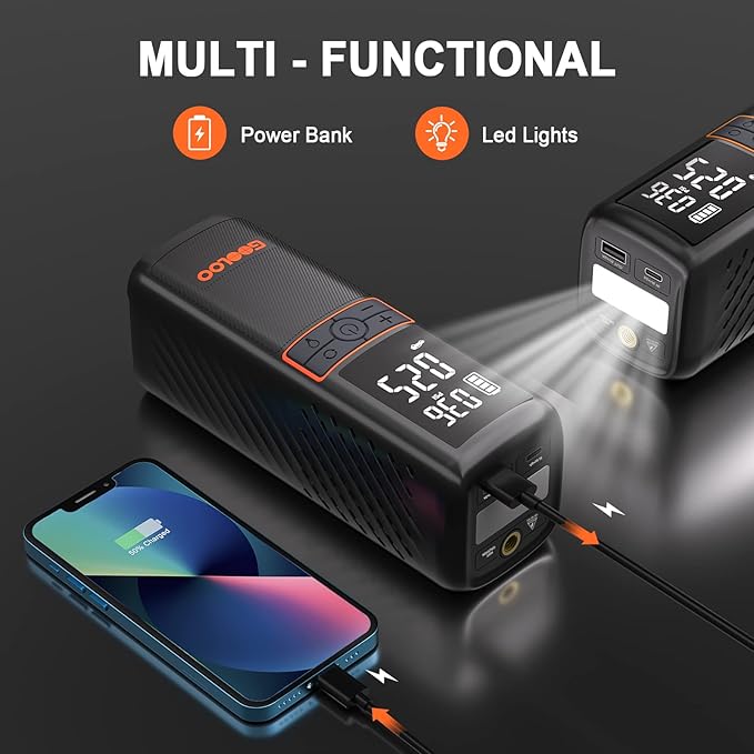 • 【Long-lasting Battery Capacity】The GOOLOO GT160 cordless tire inflator portable air compressor built-in 7500mAh rechargeable battery. One full charge can provide up to 45 minutes of wireless continuous inflation, which can support inflating 88 ball tires, or 20 bicycle tires, or 18 motorcycle tires, or 5 car tires. Moreover, its innovative design allows it to double as a power bank, providing a handy charging solution for your phone or other digital devices.
