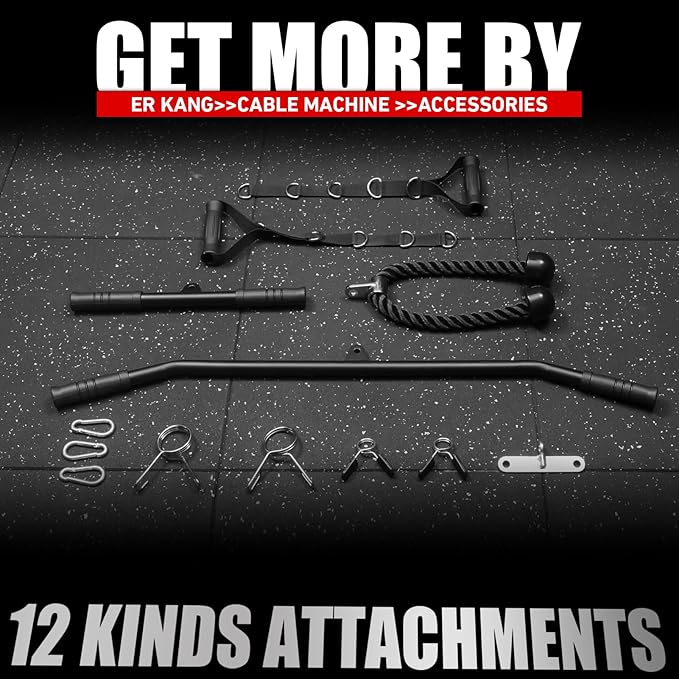 • 【DESIGNED FOR HOME GYM】Big footboard on the Base-perfect attachment for the seated cable row. Upward 10° of Weight peg can prevent weight plates slip off. It also comes with detachable sleeves to fit 1''/2'' plates. Special four buckles strap handles can let you easily adjust the length you want. Also, this machine comes with 3 additional attachments: Lat bar, Cable bar, and Tricep rope.
