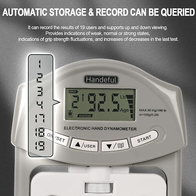 • [LCD Display] - Large LCD screen shows all measurements clearly on the same screen. Displayed measurements include user code, age, gender, grip value in pound or kg, and grip status. A maximum grip value display and weak, normal or strong power levels can be saved and easily recalled for comparison.