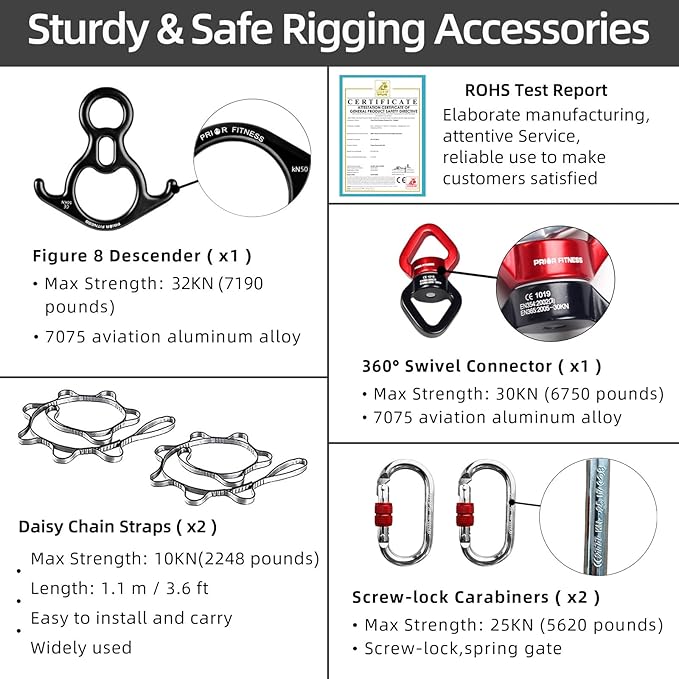 • 【Safety Tested & Guarantee】Aerial Silk is CE certified, SGS tested and recommended by certified aerial yoga teachers, Figure 8 Descender rated up to 32KN (7190pounds), 360°Swivel Connector (EN Certified) rated up to 30KN(6750 pounds), Daisy Chain Straps rated up to 10KN(2248 pounds),Screw-lock Carabiners (CE & EN Certified) rated up to 25KN(5620 pounds)