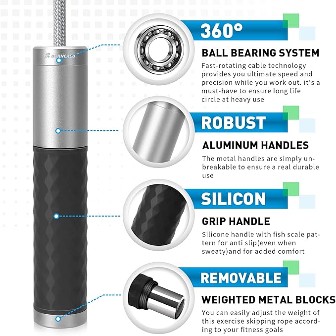 • Our upgraded 360 degree spin high-speed ball bearing system is placed inside the handles to ensure that the weighted jump rope is tangle-free, fast, and smooth. It's a must-have for heavy use, and will ensure a long life cycle.
