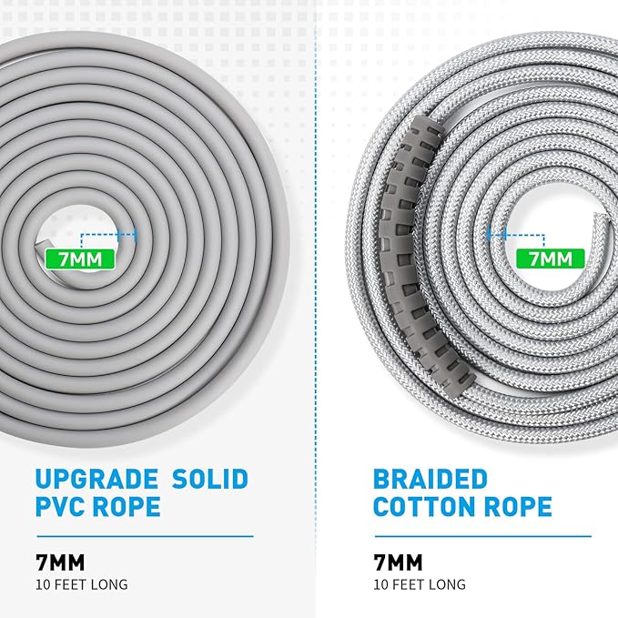 • We've added a wear-resistant silicone protective tube to our 7mm braided cotton rope, which weighs 0.2LB and is 10 feet long. And if you need a more wear-resistant option, our 7mm solid PVC rope weighs 0.28LB and is also 10 feet long. Both options require a perfect combination of speed and strength when using.