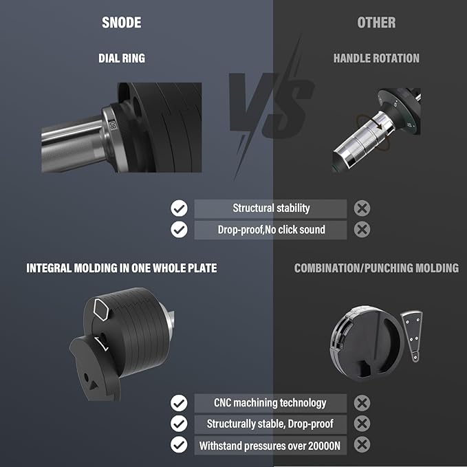 • 【Adjust weights in seconds】Turn the dial to adjust the weight. 8 weights set in one dumbbell, weight selection: 10, 20, 30, 40, 50, 60, 70, 80 lbs. SNODE Adjustable Dumbbells is to adjust the weight on both sides of the dumbbell at the same time.
