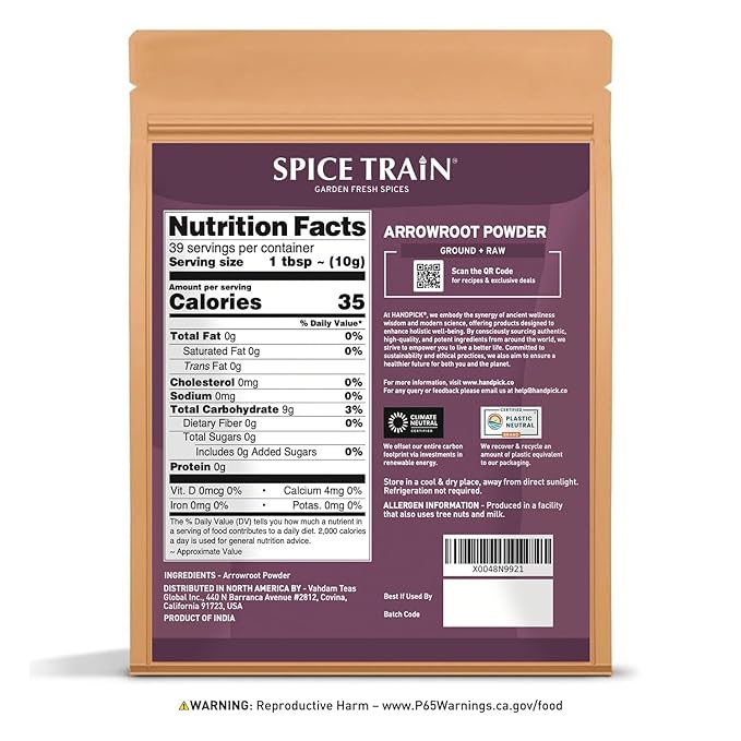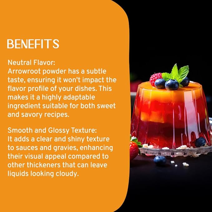 • VERSATILE ARROWROOT POWDER - Unleash Arrowroot powder's culinary versatility with ease! Thicken sauces and soups effortlessly, bake gluten-free treats for delightful textures, create crispy coatings with your favorite flavorsand craft glossy glazes and luscious dessert fillings. Elevate your culinary creations with this indispensable kitchen staple!