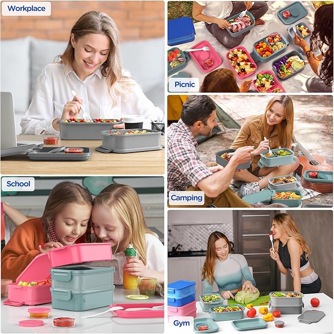 • Larger 3 Stackable Bento Box -- 74 OZ / 2190 ML large capacity, 3 layers stackable design adults lunch box, built in 2 sauce containes, fork and reusable spoon for easy dining. Not noly is it great for packing main course, sandwich, meat, salad, vegetables and more nutrient food, but also for packing nuts, fruits, yogurt, cake, candy, sauce and more, help you plan a well-balanced lunch