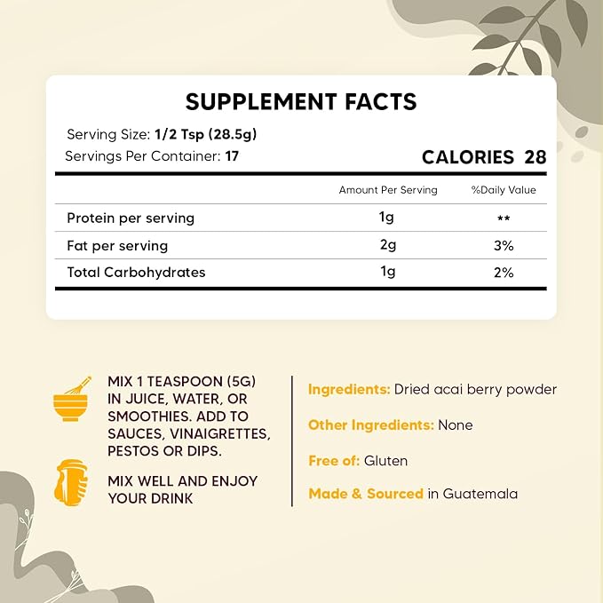 • HIGH IN ANTIOXIDANTS: Acai berry powder is high in antioxidants, vitamins E, C, B, calcium, magnesium, zinc, iron, potassium. They are a source of omega fatty acids 3, 6, and 9 and contain 16 amino acids. Acai berry powder is a great way to mix nutrient-dense antioxidants into your food
