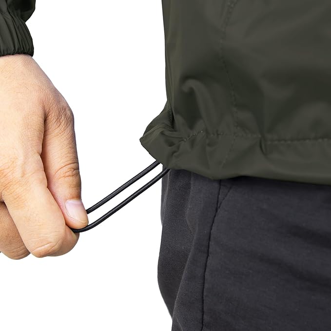 • ?�Unique Design?‘Lightweight lite rain jacket elastic cuffs prevent the rain drops to the cuffs; Adjustable drawcord hood to prevent yourself from being wet; The hem contains elastic rope for warmth and keep you dry. Suitable for casual wear, outdoor sports, outdoor work, traveling, cycling, hiking, climbing, fishing, camping, hunting.