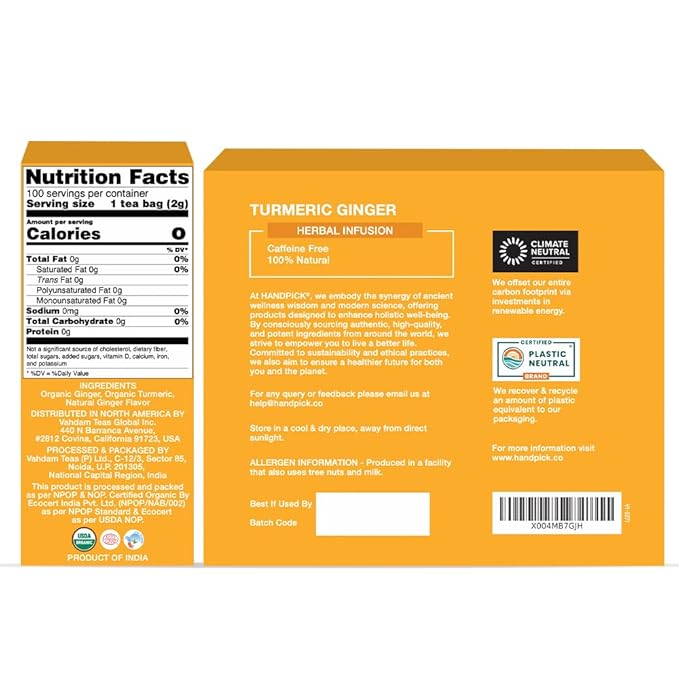 HANDPICK, Organic Turmeric Ginger Tea, 100 Eco-Conscious Tea Bags | Caffeine Free, Gluten Free, Non-GMO | 100% Pure Herbal Blend - Savory & Spicy