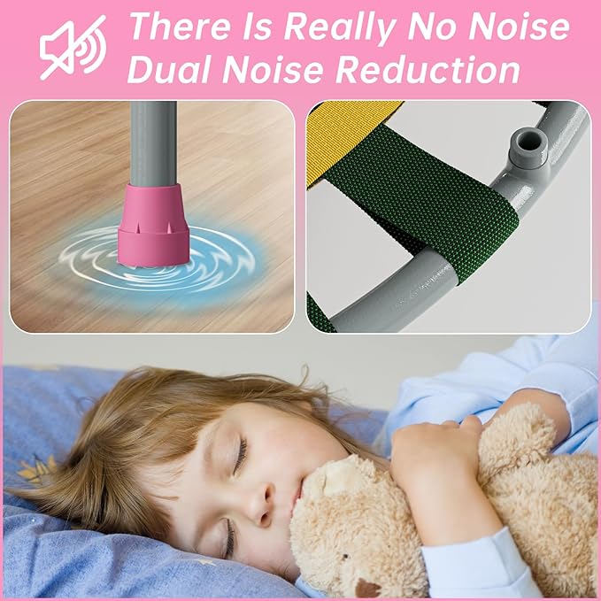 • 【SAFE AND FUN】 The padded handlebar is adjustable from 32.6” to 40.5” which fits your kid’s height perfectly. Kids can use the handlebar for easy grip to control their bounce. This springless trampoline is safer than the spring rebounders, primarily due to more soft parts. There is less of a chance of experiencing pinched fingers or toes, regardless of the safety precautions in place. Moreover, this trampoline has been added with a covering on top of the bands to provide safer jump pad surface