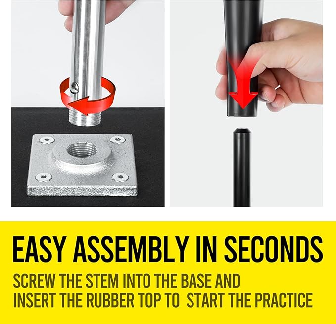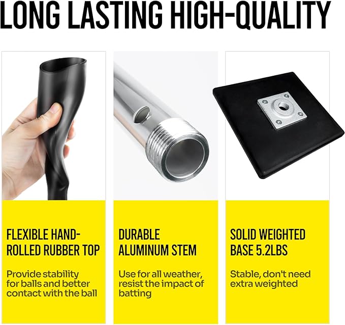 • ⚾【Durable Batting Tee】The one-piece baseball tee is made of durable metal and rubber parts. sturdy solid metal base weighs 5.2LB, 9 inches wide can withstand strong impacts and provide stability for every swing, flexible rubber top allows you to make better contact with the ball.