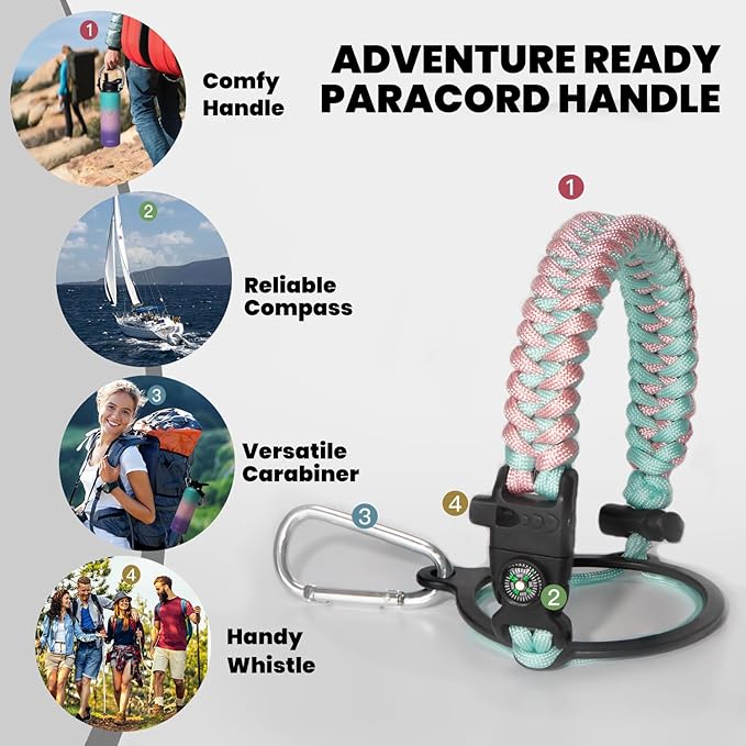 • Iconic Paracord Handle: This insulated water bottle comes with a beautiful hand knit nylon paracord in coordinated color with the water bottle. Configured with a compass and carabiner, this paracord handle is a must-have as a full functional camping / hiking flask