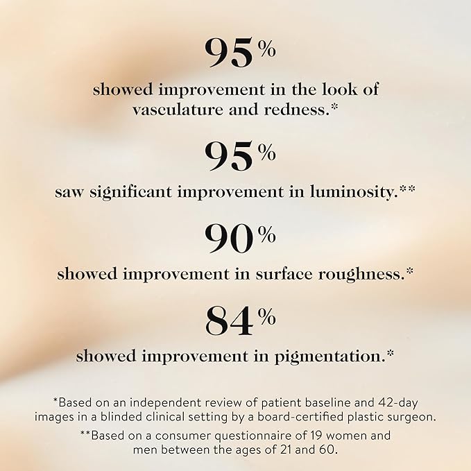 • Clinical Results: After six weeks of use:* 95% demonstrated improvement in dehydration, 95% demonstrated improvement in the look of vasculature and redness, and 90% demonstrated improvement in surface roughness.