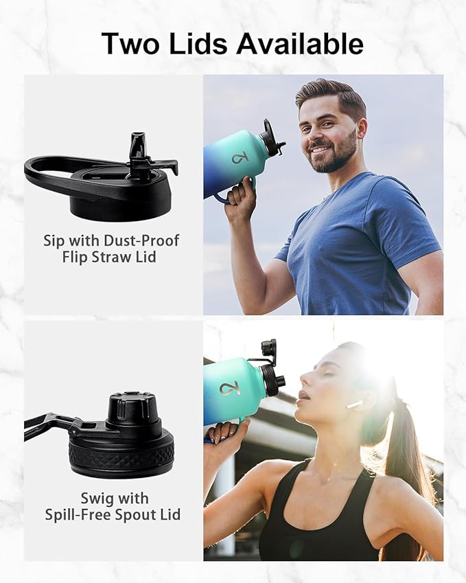 • No Spills, No Worries: Our stainless steel water bottle comes with a dust-proof flip straw lid and a spill-free spout lid, meeting your different needs. With accurate silicone seal rings, they are both 100% leak-proof and spill-proof.