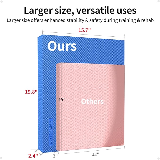 • [How to Choose]ANVICTOX balance pads are available in two sizes: the L size measures 15.8" × 13.2" × 2" (L×W×H), while the XL size measures 19.8" × 15.7" × 2.4" (L×W×H), with the XL pad offering 102 sq in more surface area than the L pad. The compact L pad is portable and suitable for children or petite adults for simple exercises, chair cushions, or daily use; conversely, the XL pad’s larger surface area accommodates taller adults, versatile training needs, and rehabilitation therapy. Therefore, choose based on your specific requirements or consult a physical therapist for personalized advice.‌