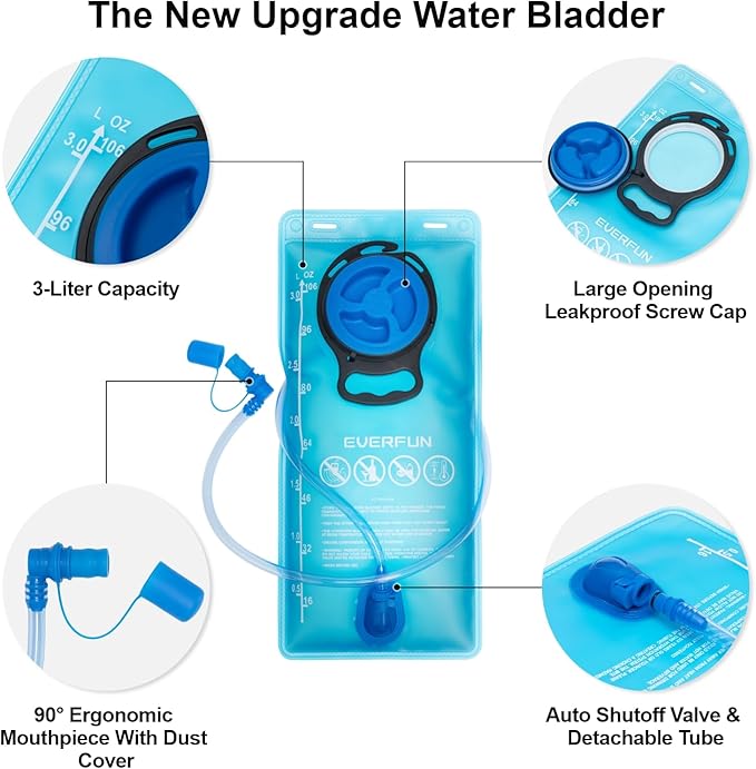 • EFFICIENT HYDRATION SYSTEM: This 18L hydration backpack includes an UPGRADED 100 oz / 3-LITER water bladder made of FOOD-GRADE PEVA material. The water Pouch has a Large Opening for easy refilling with water, ice cubes and cleaning. The high-flow bite valve is ergonomically designed for more comfortable use. The mouthpiece cover protects the bite valve against dirt and damage.
