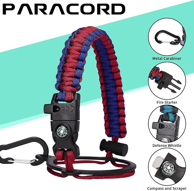 • UNIQUE DESIGNS PARACORD HANDLE: Full-function paracord handle made in individual styles to match the color of the flask water bottles. With compass, safety ring, carabiner & whistle. It unravels into a sturdy and taut rope in an emergency, making the large water jug an ideal survival kit for expeditions in the wild