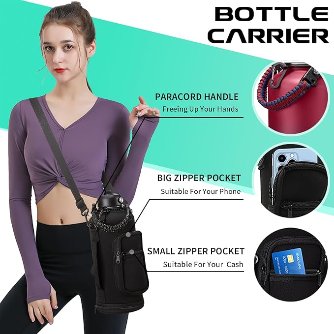 • PROTECTIVE BOOTS & STORAGE SLEEVE: Upgraded silicone boots prevent shattering and cracking when stainless steel water bottle accidental dropped. And storage carrying pouch with removable shoulder strap for convenient hands free carrying! The safe zippered pocket design to stores all your stuff, holds your cards & phone & key