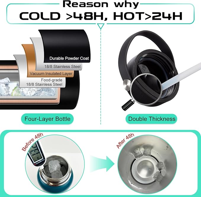 • TRIPLE-INSULATION & HIGH-PERFORMANCE: This wide mouth 2/3 gallon water bottle features triple-wall vacuum insulation and pro-grade stainless steel, it keep-cold for 48 hrs and keep-warm for 24 hrs without altering the taste and keeps your water tasting fresh. Using this metal water bottle on hot summer days or your next camping trip to stay hydrated all the day