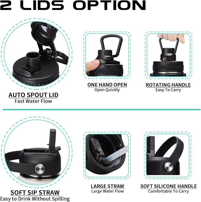 • 2 LID OPTIONS (Auto-spout & Straw): two different lids are complete LEAK PROOF & design for easy drink. The pops-up lid for easy drinking and seals shut for no leaks when you're on the go. The straw lid makes it easy to enjoy spill-proof sips, and package come with a alternative straw & a straw brush for easy cleaning