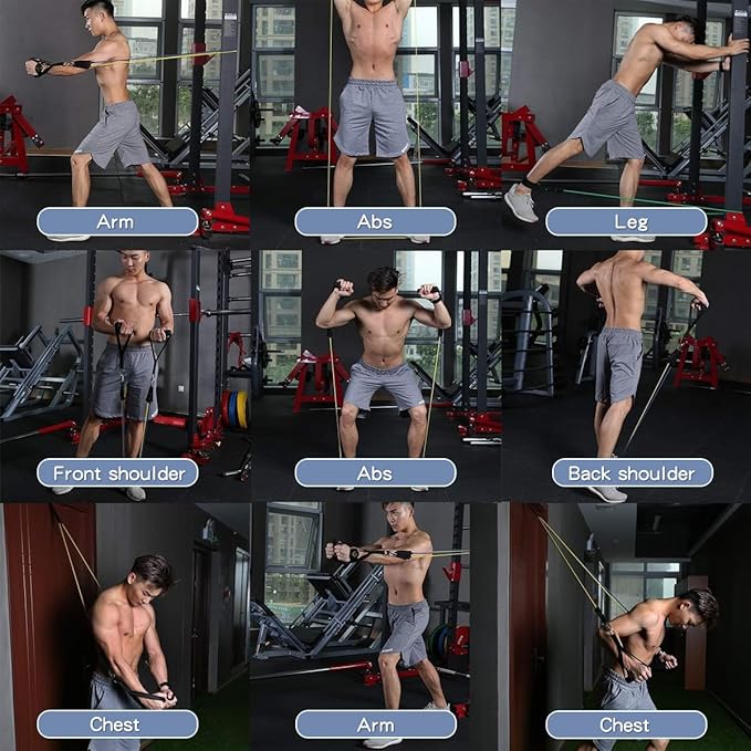 • DIFFERENT COLOR ADJUSTABLE RESISTANCE BANDS: The exercise bands come with 5 different resistance level 10lbs, 20lbs, 30lbs, 40lbs and 50lbs in 5 different colors, and and can be used alone stacked in any combination to a maximum equivalent of 150 lbs