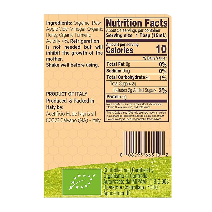 De Nigris Organic Apple Cider Vinegar With Honey & Turmeric, Raw & Unfiltered 16,9 Oz (Pack of 2) | Apple Cider Vinegar With Mother For The Balance Of Metabolism, Organic