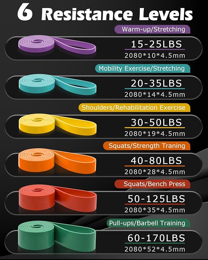 • 【Diverse Resistance Levels】: Explore our Pull Up Resistance Bands with 6 different color-coded bands, offering a distinct exercise bands resistance level: Purple (15-25 lbs), Cyan (20-35 lbs), Yellow (30-50 lbs), Orange (40-80 lbs), Red (50-125 lbs), and Green (60-170 lbs). Customize your workout by using a single band or combining multiple for increased challenge. Designed for individuals weighing 90 lbs to 300+ lbs
