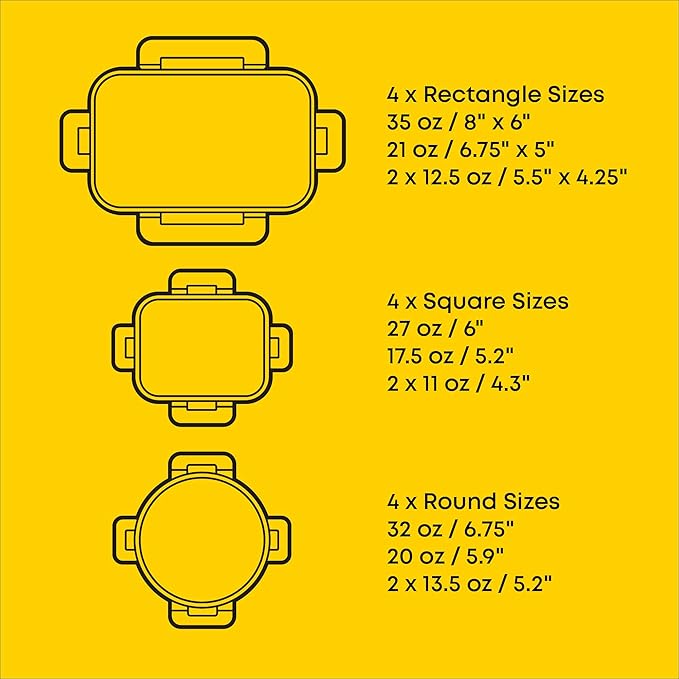 • 12 SIZES FOR EVERY NEED: Our airtight food storage containers with lids set includes 4 rectangle containers 35oz (8x6in), 21oz (6.75x5in), 12oz (two 4.2x5.5in). 4 square containers 27oz (6in), 17.5oz (5.2in), 11oz (two 4.3in). 4 round containers 32oz (6.75in). 21oz (5.9in), 13.5oz (two 5.2in). Height ranges from 1.75-2.3 inches.