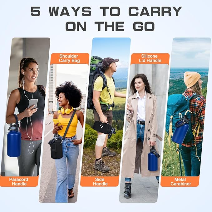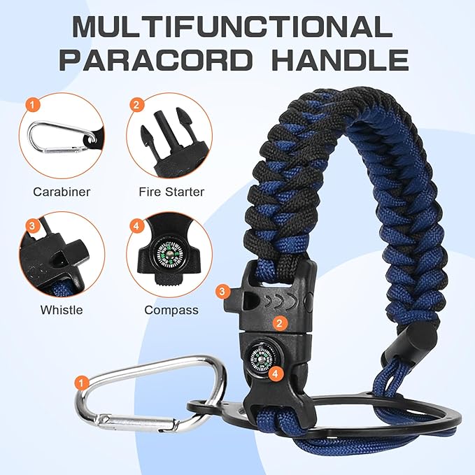 • Full-function Paracord - With brilliant matching colors brings a touch of youthful vibe to the jugs. As a sturdy survival handle it comes with a carabiner, compass, fire starter and whistle, perfect for your wild adventures.