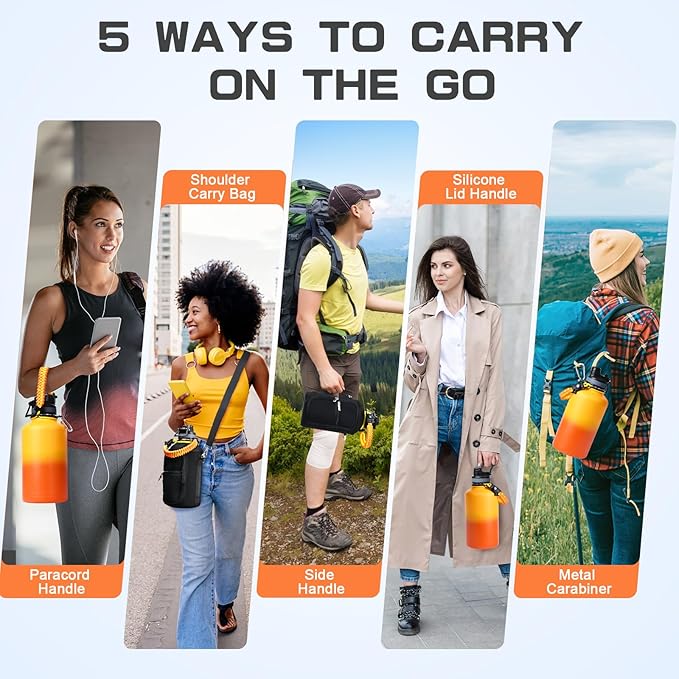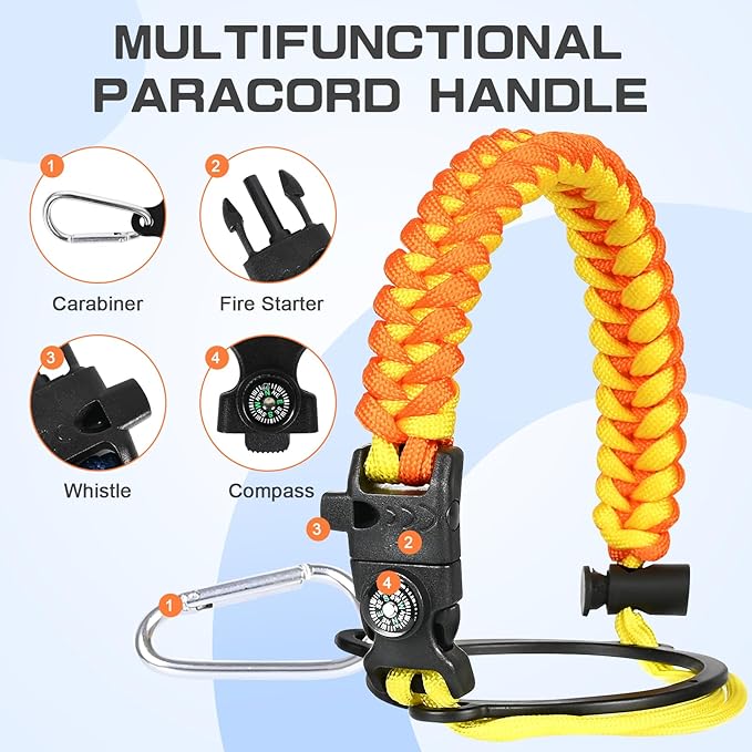 • Full-function Paracord - With brilliant matching colors brings a touch of youthful vibe to the jugs. As a sturdy survival handle it comes with a carabiner, compass, fire starter and whistle, perfect for your wild adventures.