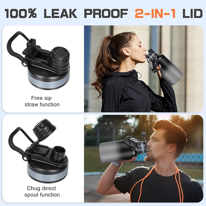 • Dual Use 2-in-1 Lid - 100% Leak-proof half gallon insulated water jug lid features a straw and chug lid function. With this spill-proof two-in-one lid, you can sip freely when you are busy or on the go.