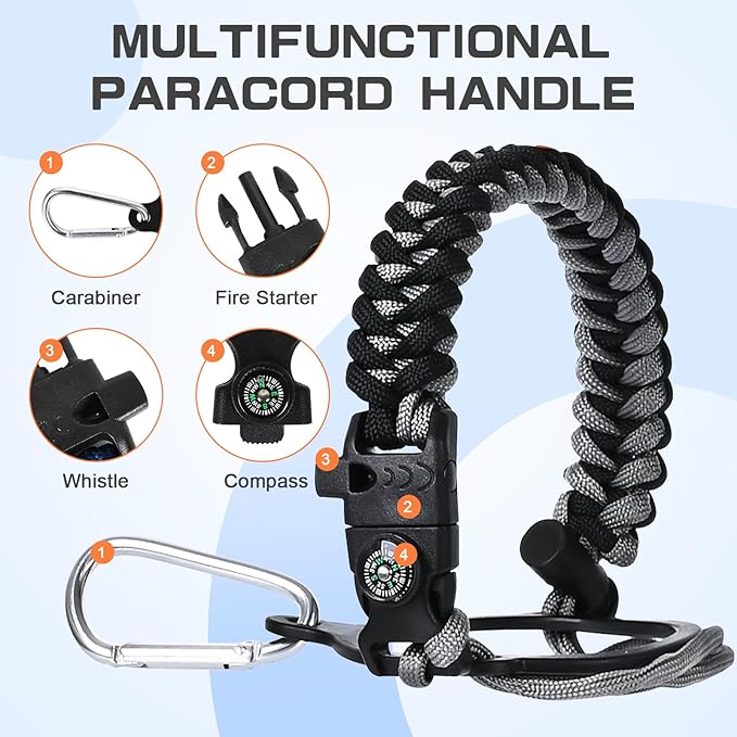 • Full-function Paracord - With brilliant matching colors brings a touch of youthful vibe to the jugs. As a sturdy survival handle it comes with a carabiner, compass, fire starter and whistle, perfect for your wild adventures.