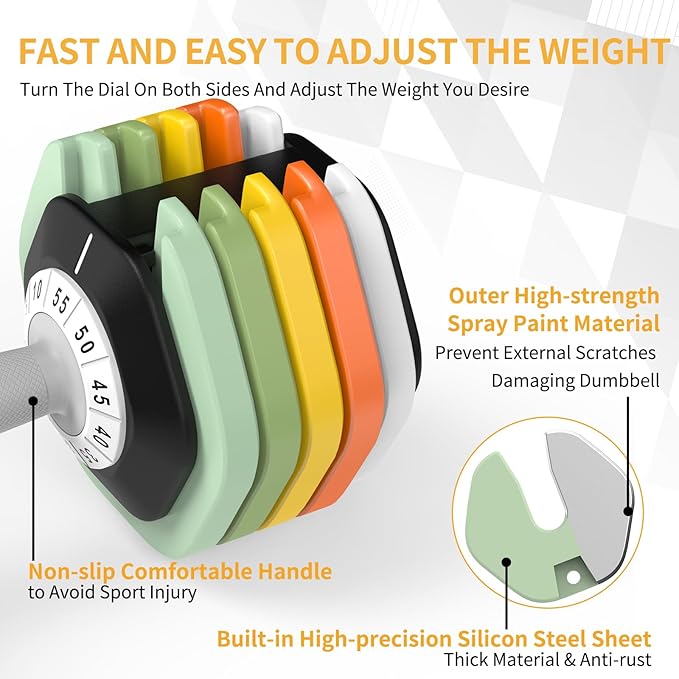 • 【New Structural Design】Exclusive design of adjustment countweight plate, simply adjust by holding the handleaccording to the weight you need, turn the pointer to the corresponding number to adjust. The latest design locks the dumbbells with 8 locking, which ensure the dumbell set are fastened stably and tightly to ensure your safety.