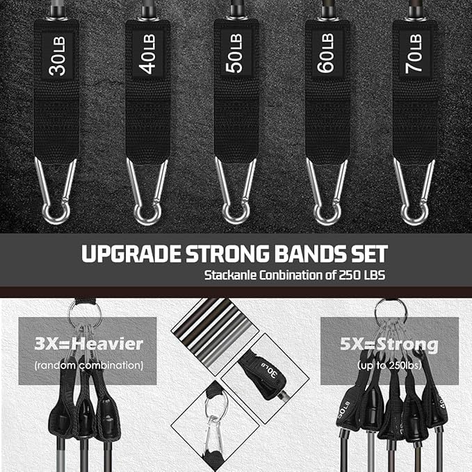 • Adjustable Resistance Bands - These 48-inch exercise bands for working out come in 5 resistance levels(30lbs, 40lbs, 50lbs, 60lbs and 70lbs), each with a distinct color. You can use them individually or combine them for a maximum resistance of 250lbs