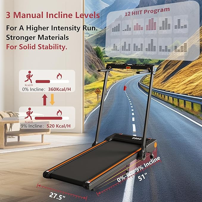 • [3-Level 9% Incline Treadmill] Designed for diverse fitness needs, this walking pad with incline offers 3 manually adjustable levels (0%, 6%, 9%) to simulate flat roads or uphill climbs, helping you burn more calories and engage different muscle groups. With 12 preset programs (P1–P12) that support one-touch workout customization, this portable treadmill adapts to beginner and advanced routines alike—perfect for cardio, weight loss, or daily walking at home