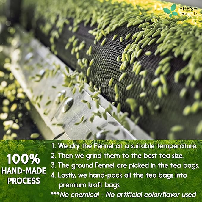 • ☘️ FENNEL TEA BAS MADE BY A HAND-MADE PROCESS: Fennel Seeds are picked at their flavorful/colorful peak and naturally sun-dried to perfection. We hand-select only the premium seeds of Fennel for the utmost quality. Then we grind the herbal seeds into the best tea size. Next, we immediately pack it in eco-friendly tea bags. Lastly, we pack the tea bags into food-grade kraft bags for ultimate freshness.