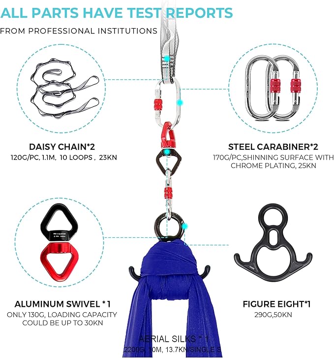 • SILK STYLE - This aerial silk products are made of high-quality materials and well-designed to ensure safety. Our Aerial Silks Kit have undergone strict testing and certification to ensure that there are no safety hazards during use. At the same time, we provide detailed instructions and operation videos to make you feel more at ease when using them.