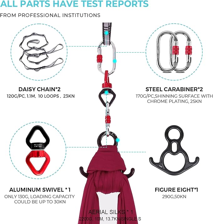 • SILK STYLE - This aerial silk products are made of high-quality materials and well-designed to ensure safety. Our Aerial Silks Kit have undergone strict testing and certification to ensure that there are no safety hazards during use. At the same time, we provide detailed instructions and operation videos to make you feel more at ease when using them.