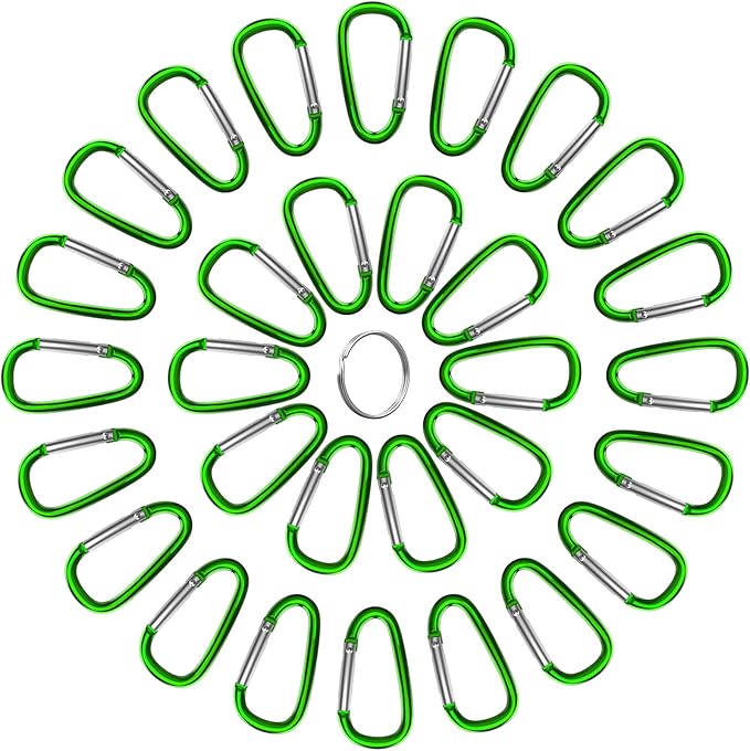 • 【Design】-Green Aluminum Caribeener Clips, Silver Steel Ring. Spring-Loaded Closing Gate Makes it smoothly to open and close. Coloring through an oxidation process, which makes it very difficult to fade/rust, except scratching.