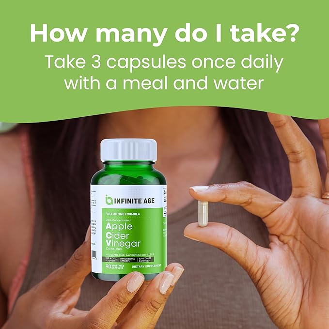 • Apple cider vinegar capsules - Embrace a holistic approach to your daily health regimen with Infinite Age Apple Cider Vinegar Capsules. Our premium ACV formula is designed to support overall wellness, providing a natural boost to your body's systems. These capsules are your ally in maintaining a balanced lifestyle.