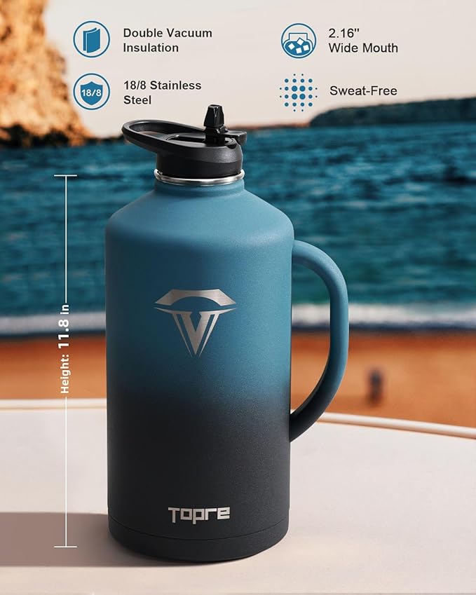 • Easy-Grip & Sturdy Handle: Topre one gallon water bottle features an ergonomic hollow design on its handle, ensuring comfortable grip and easy lifting. Perfect for effortless single-handed use while on the go. Quench your thirst with its generous 128 ounce large capacity –prompt hydration at your fingertips.