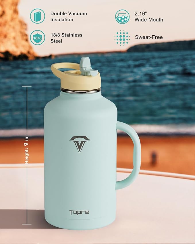 • Easy-Grip & Sturdy Handle: Topre half gallon water bottle features an ergonomic hollow design on its handle, ensuring comfortable grip and easy lifting. Perfect for effortless single-handed use while on the go. Quench your thirst with its generous 64 ounce large capacity –prompt hydration at your fingertips.