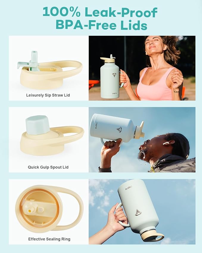• No Leakage, No Spills: Our stainless steel water bottles comes with a dust-proof flip straw lid and a spill-free spout lid, both 100% leak-proof and spill-proof. The two lids showcase a vibrant color-contrast design, harmonizing with the bottle body's color and adding an extra touch of allure.