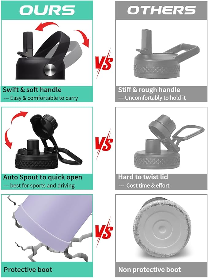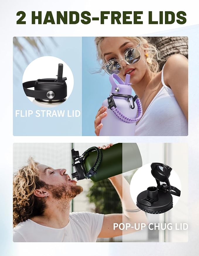 • 2 LID OPTIONS (Auto-spout & Straw): two different lids are complete LEAK PROOF & design for easy drink. The pops-up lid for easy drinking and seals shut for no leaks when you're on the go. The straw lid makes it easy to enjoy spill-proof sips, and package come with a alternative straw & a straw brush for easy cleaning