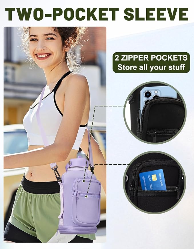 • PROTECTIVE BOOTS & STORAGE SLEEVE: Upgraded silicone boots prevent shattering and cracking when stainless steel water bottle accidental dropped. And storage carrying pouch with removable shoulder strap for convenient hands free carrying! The safe zippered pocket design to stores all your stuff, holds your cards & phone & key