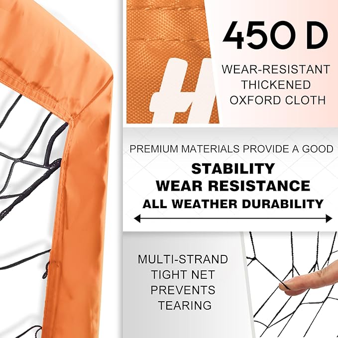 • 【Long-lasting Thickened Material】 The soccer goal is made of 450D thickened oxford cloth, 10mm high elastic fiberglass pole and strong 3-layer polyester soccer net. This ensures exceptional performance even against powerful shots, maintaining its all-weather durability and it won't fade or wear even if it is placed outdoor for a long time.