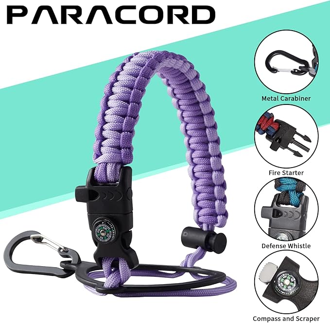 • UNIQUE PARACORD HANDLE: Bright color paracord matches the flask water bottle to give you a youthful vibe while adding a personal style. With a compass, safety loop, metal carabiner, flint, igniter and whistle to become your survival tool, making the 32 oz stainless steel water bottle with paracord an ideal survival kit for expeditions in the wild