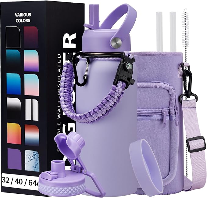 • SUPER JOYFUL COMBO: Buy 32oz insulated water bottles and get 9 accessories (2 x lids, 1 x survival paracord, 1 x carrying pouch, 1 x shoulder strap, 1 x protective cup mat, 2 x straws, 1 x straw brush). WITH A LIFETIME GUARANTEE, these thermal water bottles are perfect gifts for using at home, work, school, road trips, hiking, sporting events, or just hanging out